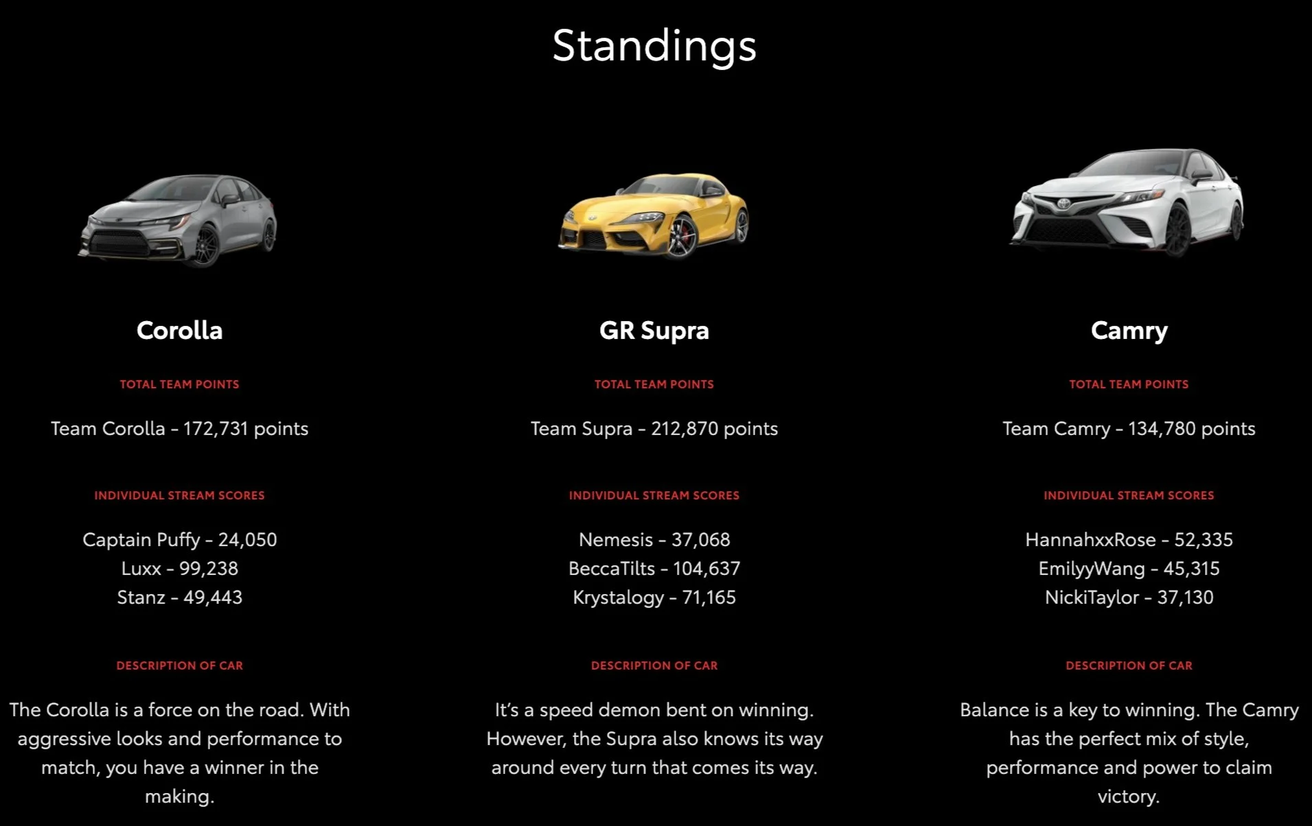 The “Drive Your Game” contest placed Twitch streamers in teams of three and encouraged fans to use the new Toyota Sedan emotes in channels for a chance to win community prizing. The campaign lasted nine days.